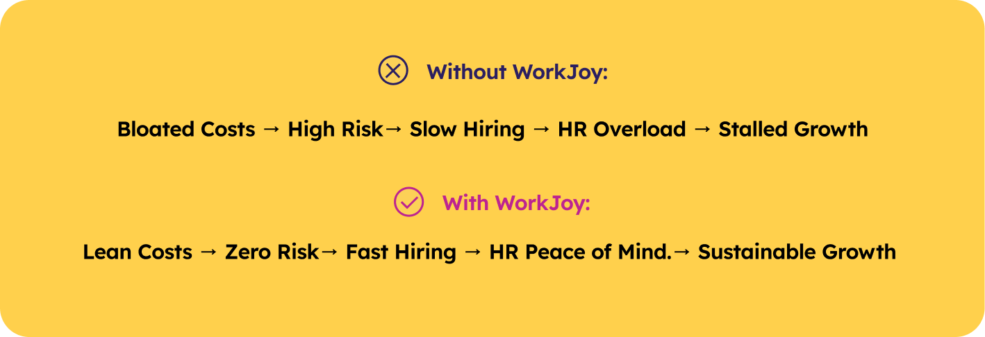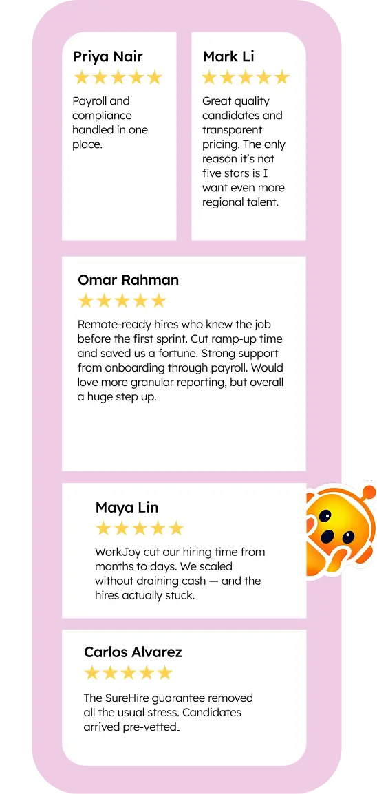 Recruiters can charge a huge part of the annual salary upfront, and they disappear once the candidate is placed. WorkJoy works differently: we’re your ongoing partner. With our subscription model, you get predictable costs, unlimited replacements, payroll, and compliance handled — all under one roof.