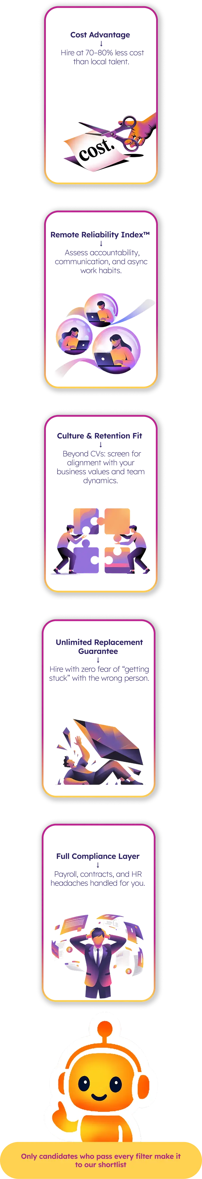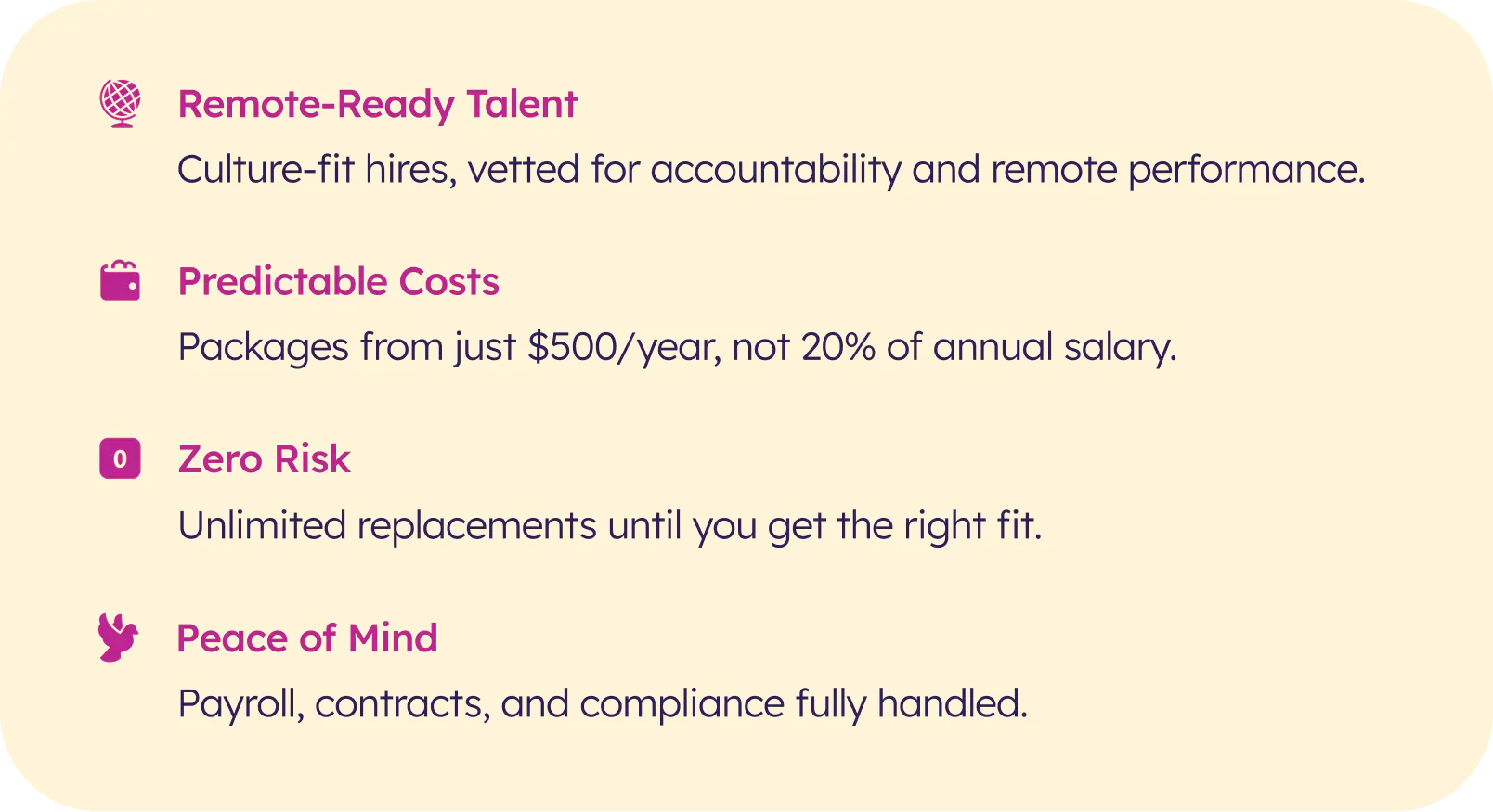 Yes — when properly screened. That’s why the SureHire™ system tests for accountability, communication, and culture fit, not just skills. Our clients often find remote hires outperform local staff — at a fraction of the cost.