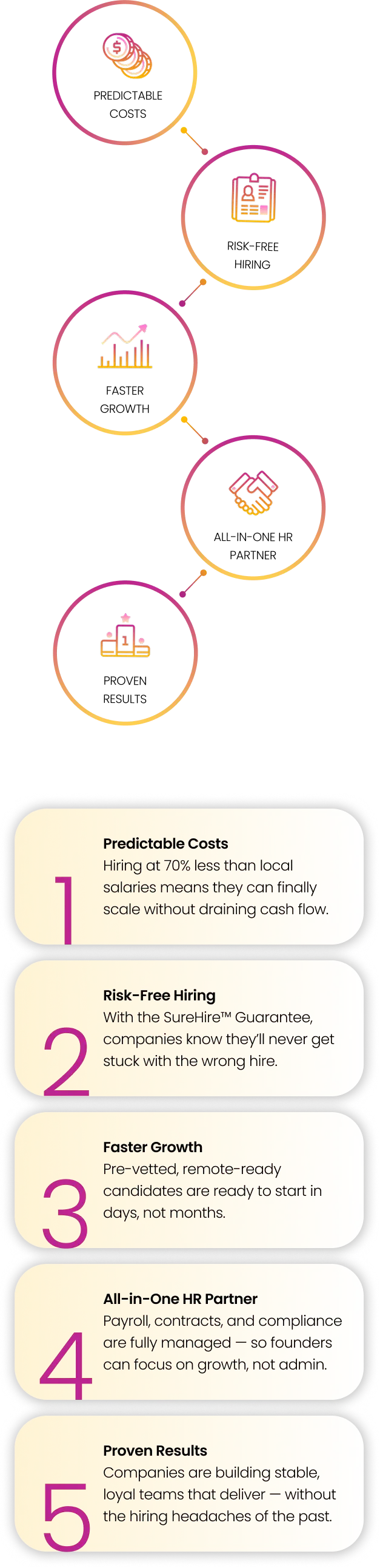 Discover how we help companies scale teams at 70% less cost — while removing the #1 fear of hiring: mis-hires that drain cash, time, and momentum.