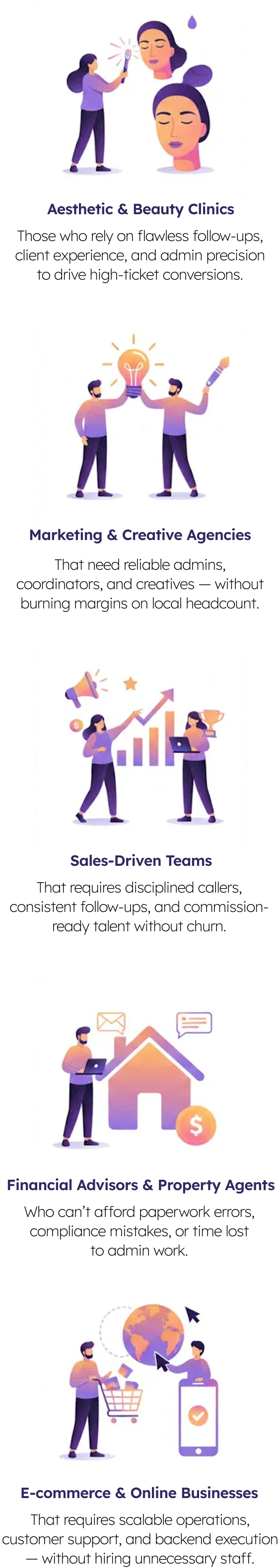 A beauty and aesthetic clinic replaced local client success hires with trained offshore associates. Remote CSEs handled appointment scheduling and client follow-ups, freeing local consultants to focus on selling and upselling.